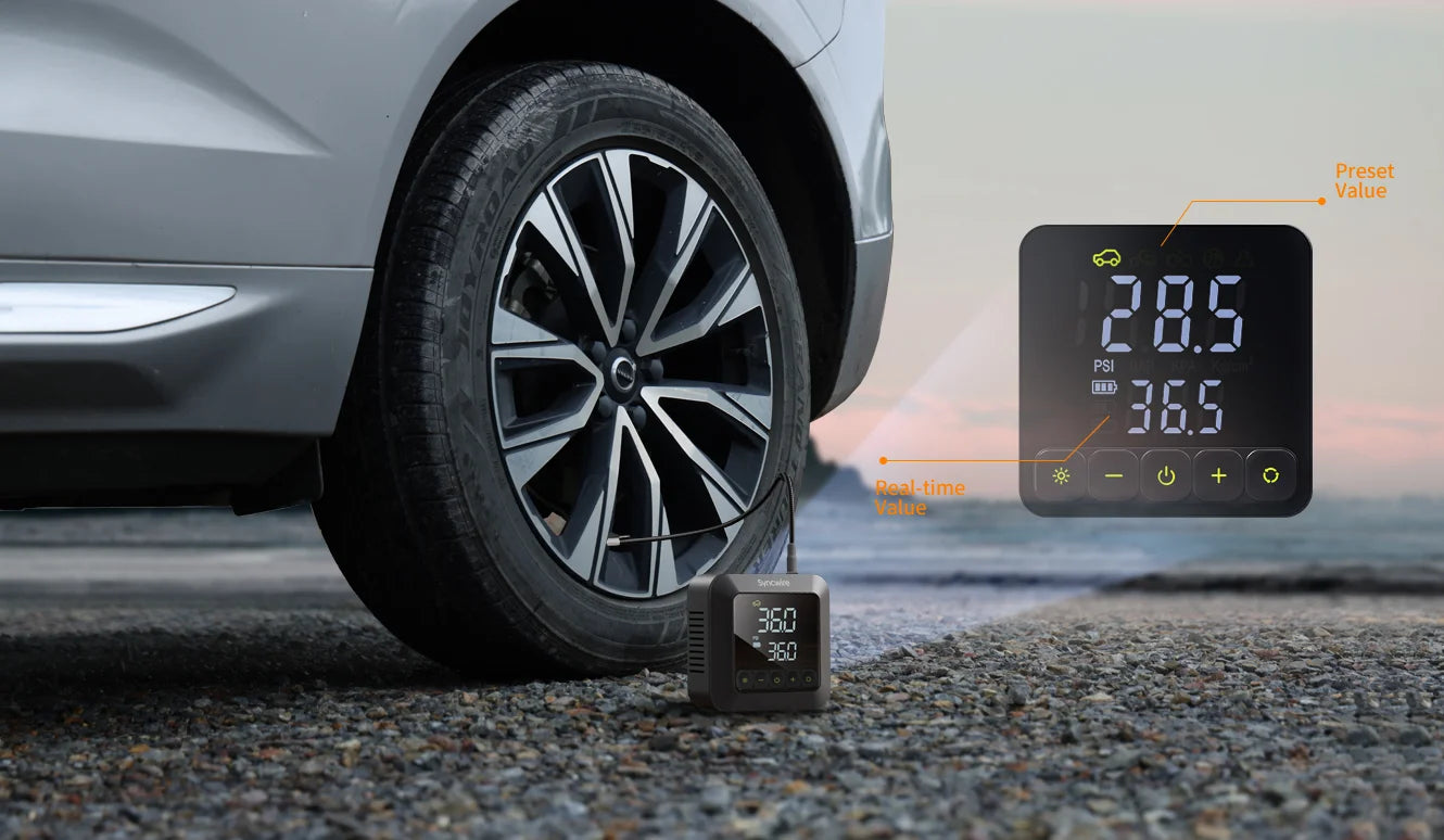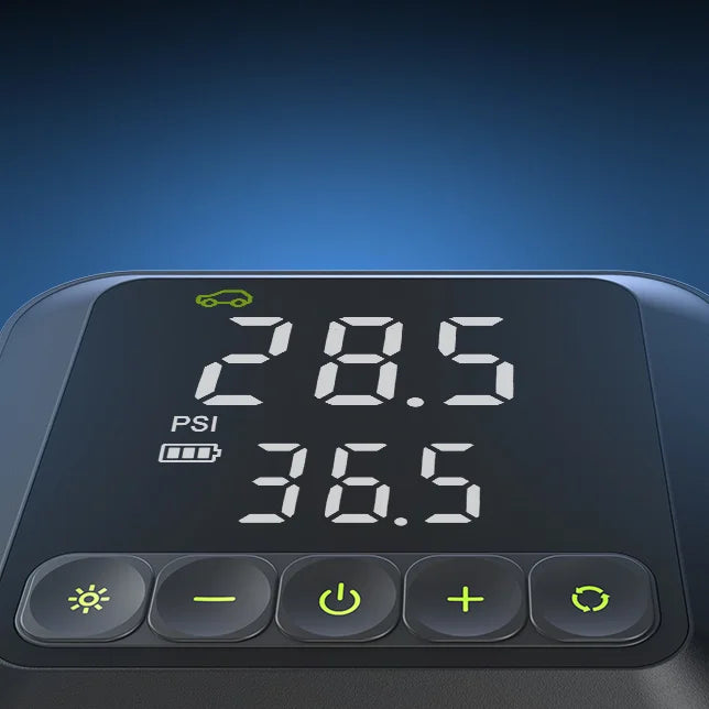 The tire inflator features a high-precision sensor that provides accurate pressure readings within ±0.5 PSI, ensuring precise inflation.