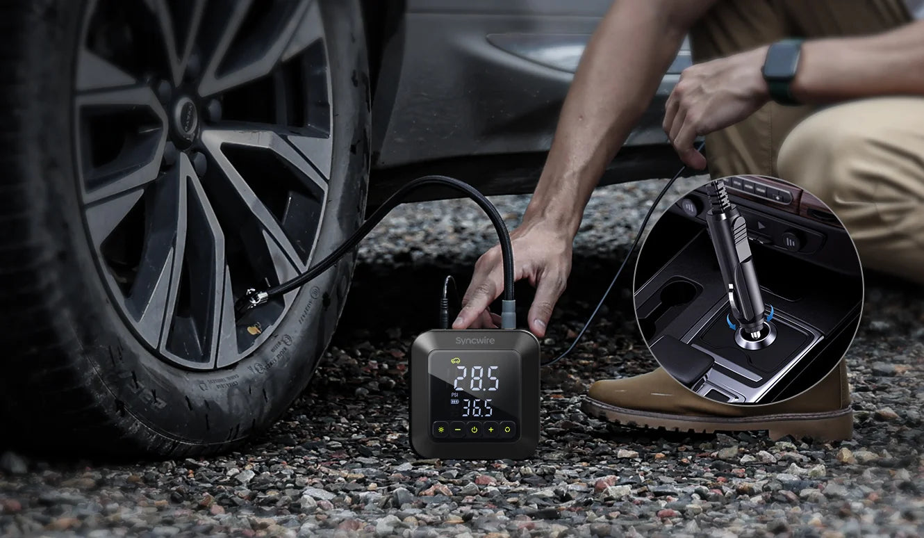 The Syncwire tire inflator is versatile and can be used on car tires, bicycles, motorcycles, sports equipment, and more. It comes with various nozzle adapters to fit different needs.